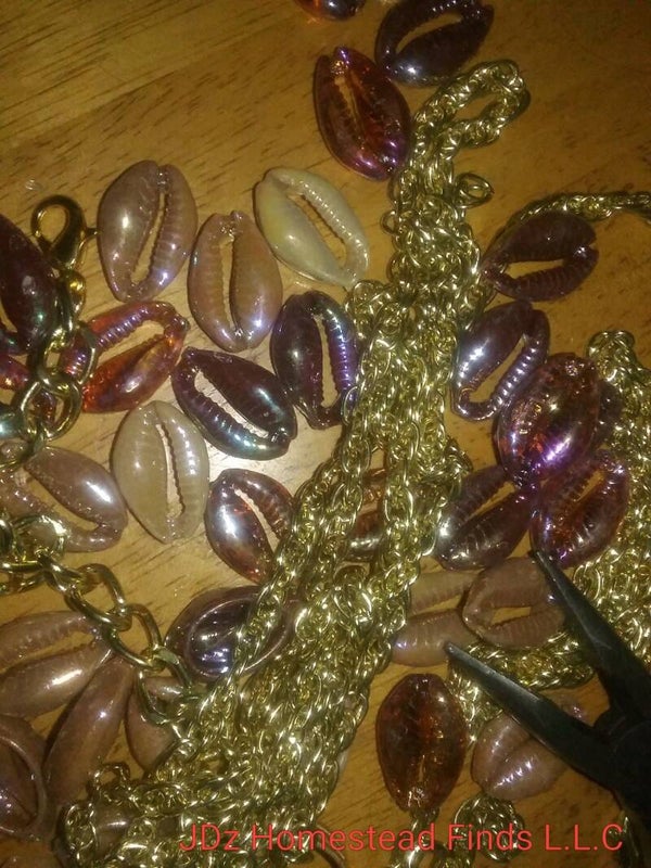 This faux cowrie style anklet is hard to find. I've had it on my shopping wish list for several months. It just doesn't seem to want to come back into stock. Then it hit me......Why don't I just make my own version of it? And here we have it. The first two pics display the final product. The last two show it in the making. Definitely an eye turner. One size comfortably fits most. Perfect for any occasion.