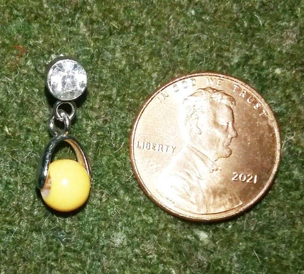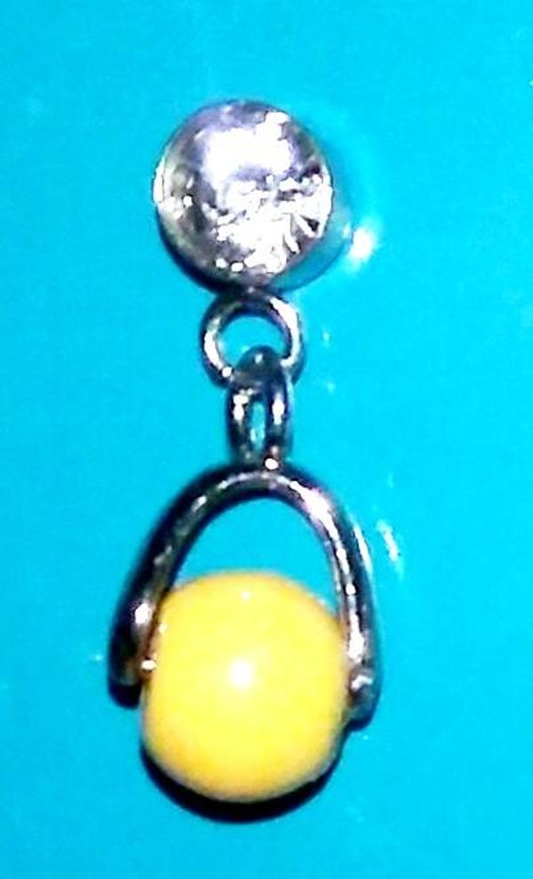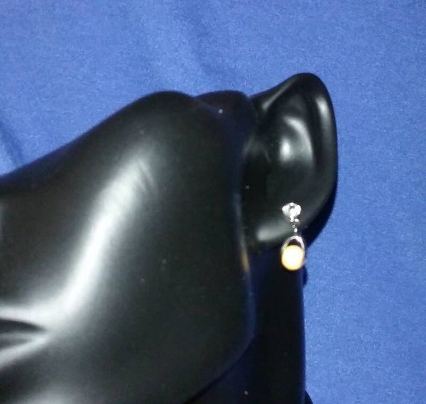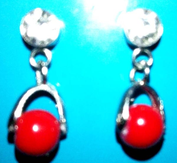 These minimalistic earrings are nickel free. Simple and classy accent to any attire. Faux diamond round head, encased in silver is linked to the stirrup. The bead suspended by the stirrup comes in red, yellow, and clear with a brown line. G