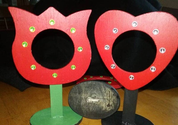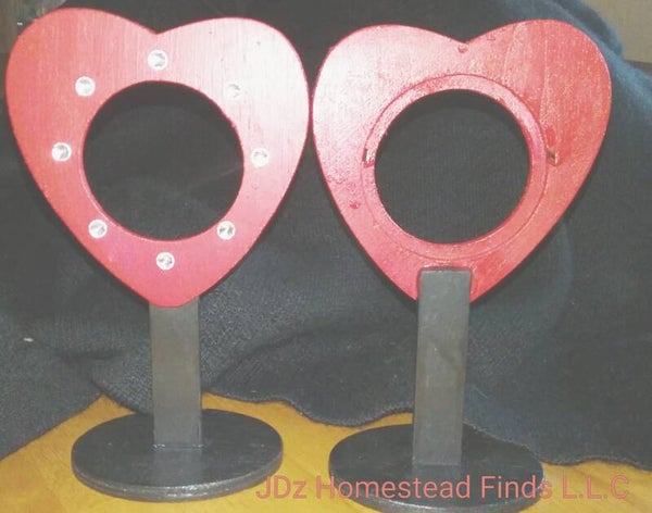 These cute little frames will be a nice accent to an office desk or mantle. Made from wood, painted with acrylic paint, and decorated with glass stones. The back of the frames have the metal malleable prong to hold in your picture.