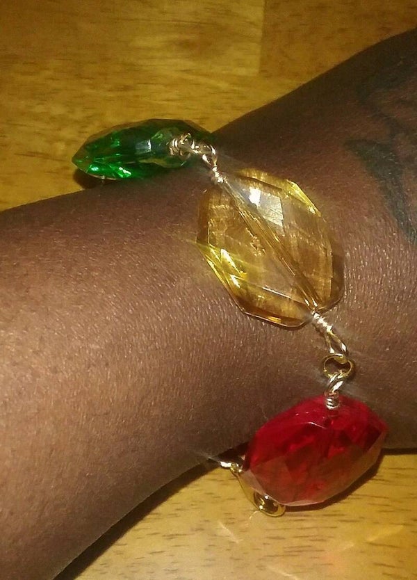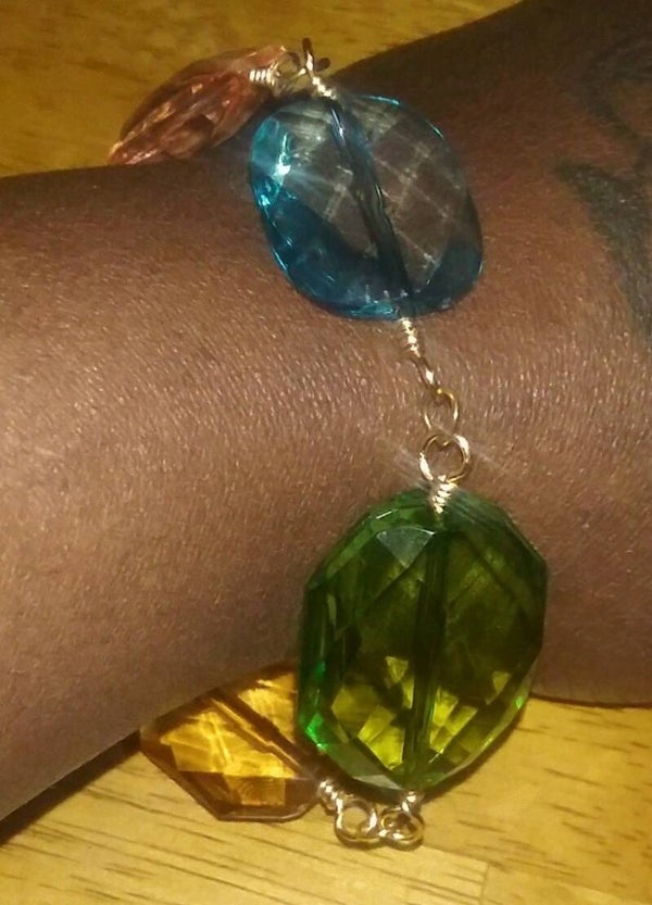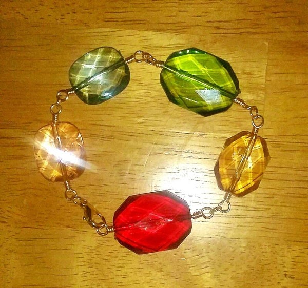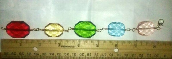 Red, yellow, green, blue, and pink glass beads linked together form this one of a kind bracelet. The playful colors allow for fun outfit match ups. This is on my one of a kind list.