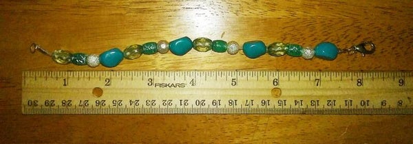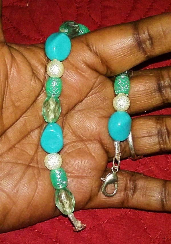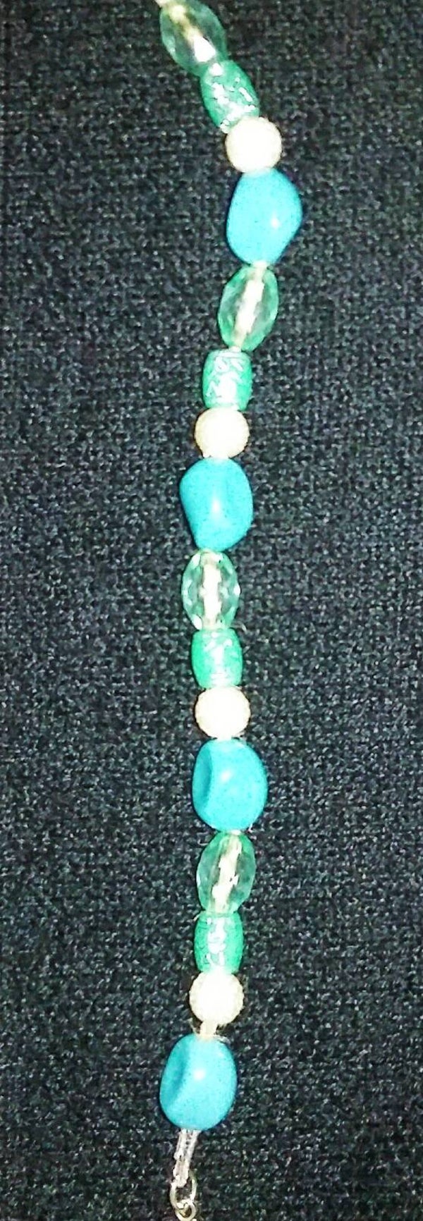 Teal and pearl colored beads on a strong hemp cord. Lobster closure. One size fits most.