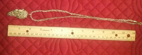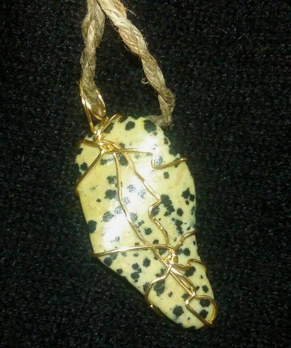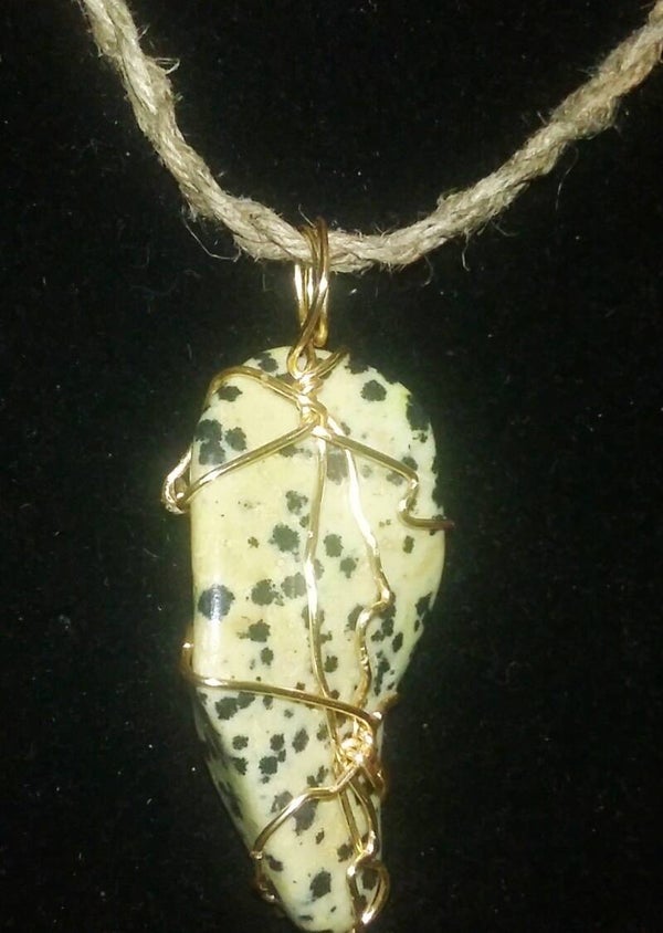 I tumbled this dalmation stone for one month. After the stone was ready, I wire wrapped it with gold toned copper wire. I braided hemp cord to complement the organic nature of the rock. Beautiful piece for a man or woman. One of a kind necklace.