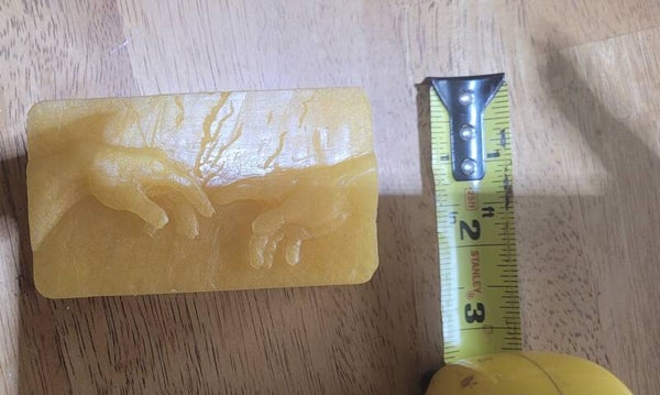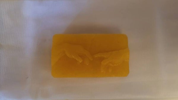 Attention to detail went into this aloe based soap bar. It is a nice reflection and depiction of God giving life to man. Keeping in mind frankincense, myrrh, and gold have been used for gifts given to kings and dieties; I used those scents and color to decorate this depiction of the King of kings.